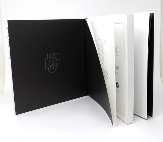 Hardcover CD Book 5-19/32" x 7-3/4" (142mm x 192mm) Portrait - 112 pages printing black x black on uncoated paper. Front endpaper with integrated single CD wallet, Back endpaper with integrated double CD wallet, both in reflex blue, Casewrap printing 4c on 125gsm Wibalin Buckram White. Sewn signatures, fully cased with 3 CDs inserted into wallets.