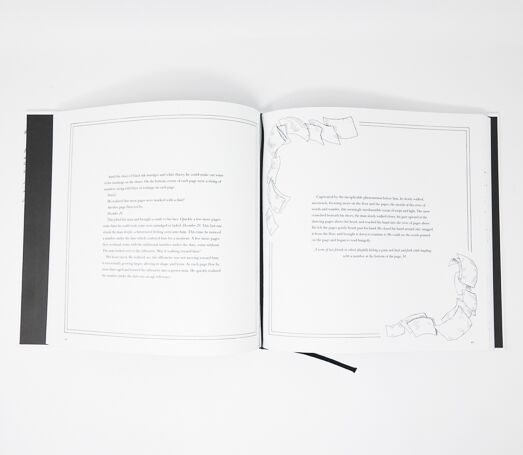 Hardcover 10" x 10" (254mm x 254mm) Square 136 pages printing black x black on 150gsm Munken Print white. Endpapers printing black x black on 140gsm offset. Casewrap printing black + Soft Touch lamination + raised spot UV on silk paper over 3mm board. Sewn signatures, fully cased with black head & tail bands + black ribbon marker. Tags: Hardbound Book, Spot UV Gloss