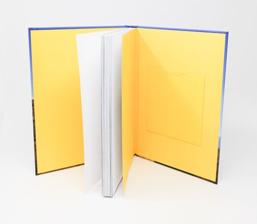 Hardcover CD Book 5-19/32" x 7-3/4" (142mm x 192mm) Portrait - 112 pages printing black x black on uncoated paper. Front endpaper with integrated single CD wallet, Back endpaper with integrated double CD wallet, both in reflex blue, Casewrap printing 4c on 125gsm Wibalin Buckram White. Sewn signatures, fully cased with 3 CDs inserted into wallets. Tags: CD Book, Custom, Hardbound Book