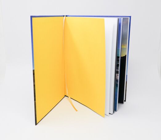 Hardcover 7-1/2" x 10" (191mm x 254) Portrait 168 pages printing 4c x 4c on 140gsm uncoated offset. Endpapers printing 1c x 1c on 140gsm uncoated offset. Casewrap: 4 color printing + anti-scratch matt lamination on 135gsm gloss coated paper over 3mm board. Sewn signatures, separate ends, fully cased with head & tail bands and a ribbon marker.